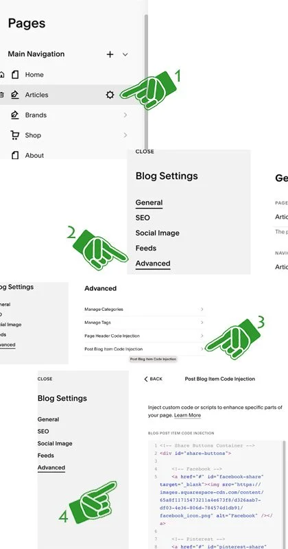 WEBSITE -> PAGES -> Click the Coqwheel -> ADVANCED -> POST BLOG ITEM CODE INJECTION -> paste the code in -> Then Save